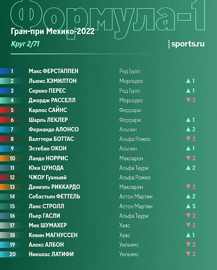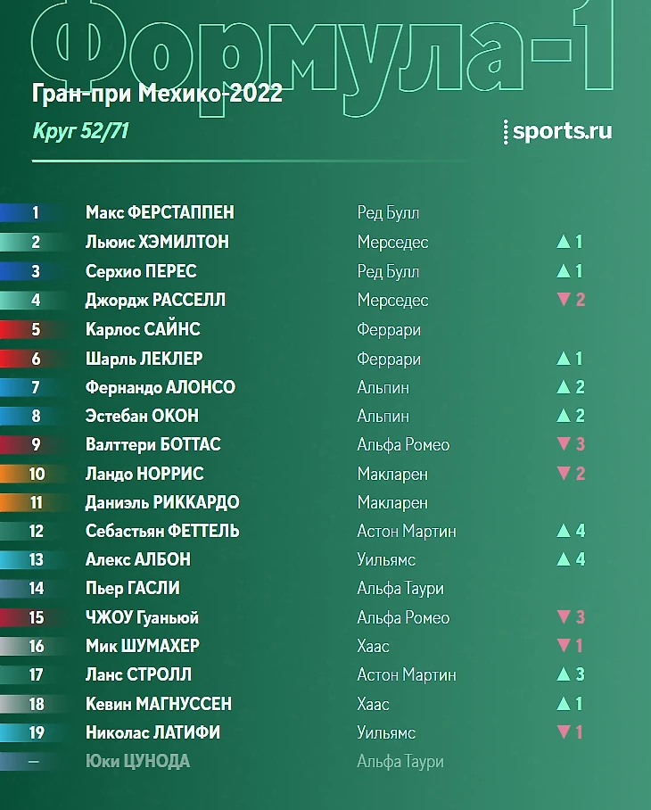 Ферстаппен немного нарастил преимущество впереди, оторвавшись от Хэмилтона на 2,2 секунды. Перес и Расселл по-прежнему позади. "Феррари" - еще чуть дальше.