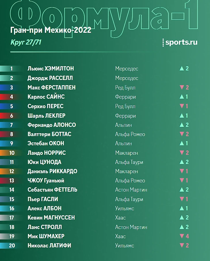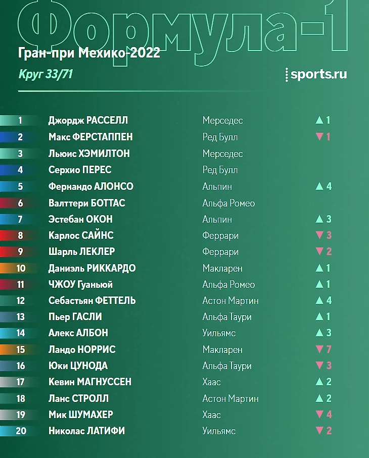 Перес начал терять темп и резко отстал от Хэмилтона уже на 4 секунды. Расселл же в 4,5 секундах позади. Возможно, борьба за подиум все-таки будет.