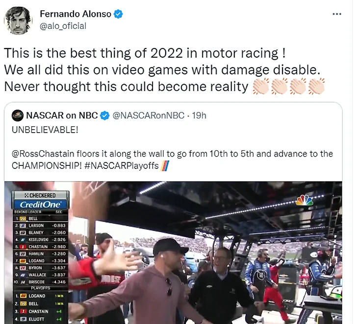 Реакция двукратного чемпиона «Ф-1» Фернандо Алонсо – «Лучшее, что было в гонках в 2022-м! Все так делали в играх после отключения повреждений. Никогда не думал, что такое возможно в реальности».