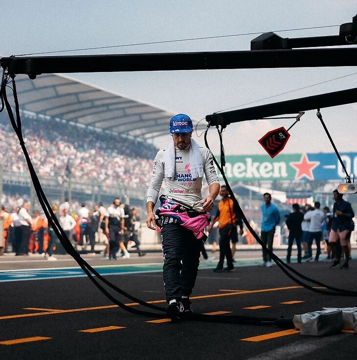 Фернандо Алонсо проводил шикарный Гран-при Мексики: выдал официально лучший старт уик-энда, вырвался на седьмую позицию на первом круге (первым после всех за большой тройкой «Феррари», «Мерседеса» и «Ред Булл»), проехал дольше всех в лидирующей группе на одном комплекте «медиума» и с комфортом реализовывал стратегию одного пит-стопа.