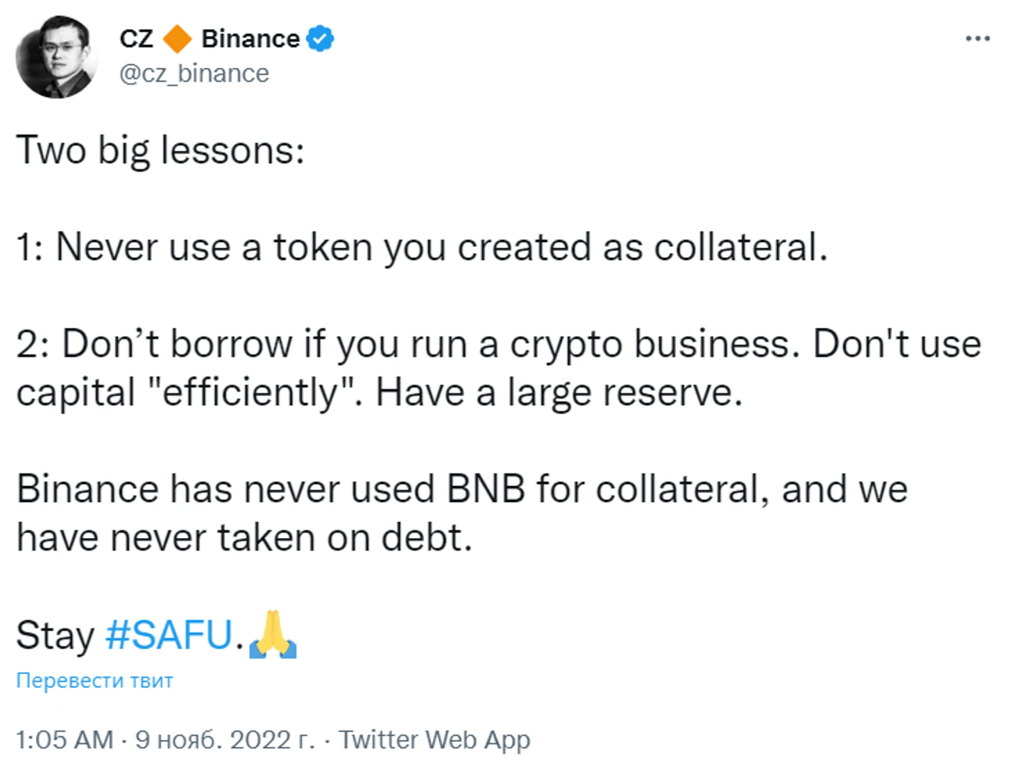 Выяснилось, что биржа еще и выдавала фонду деньги клиентов в виде займов, а получала в залог собственные токены – Чжао так демонстративно и заявил об этом в твиттере: «Два больших урока: 1) Никогда не используй свой же токен в качестве залога, и 2) Не используй заемные средства, если управляешь криптобизнесом».