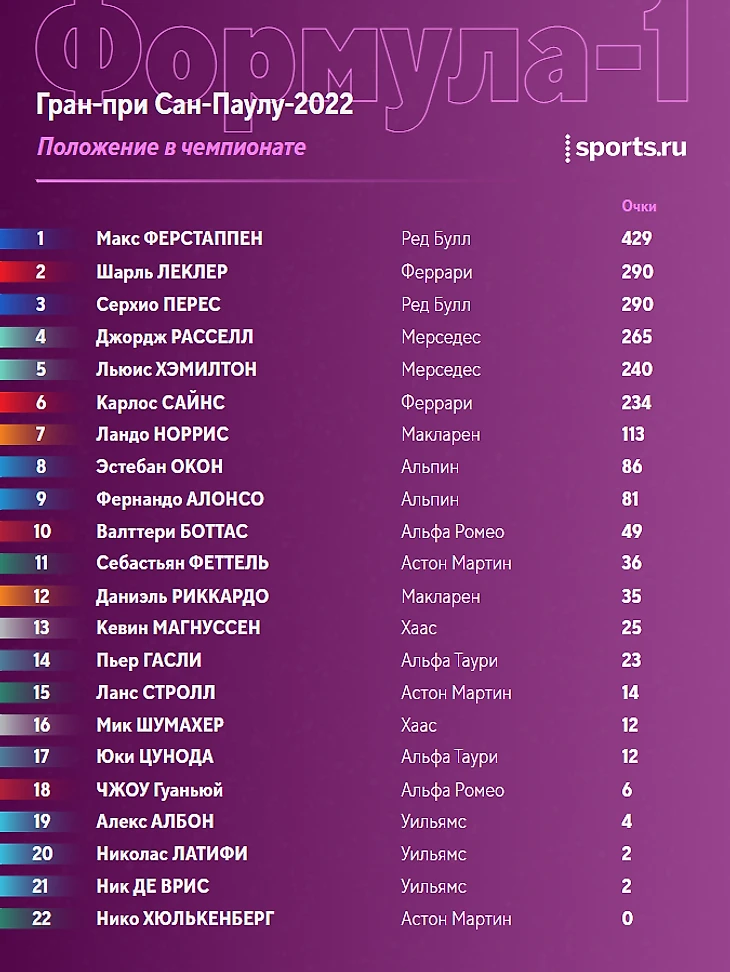 Для понимания: шестая позиция несла ноль смысла для Ферстаппена, зато имела огромное значение для Переса – Серхио сражается за второе место в чемпионате. После бразильского этапа он едет на финал в Абу-Даби с 290 баллами – ровно как и конкурента Шарля Леклера (гонщик «Феррари» впереди из-за преимущества по победам), а дополнительная позиция дала бы ему задел в 1 дополнительный пункт.