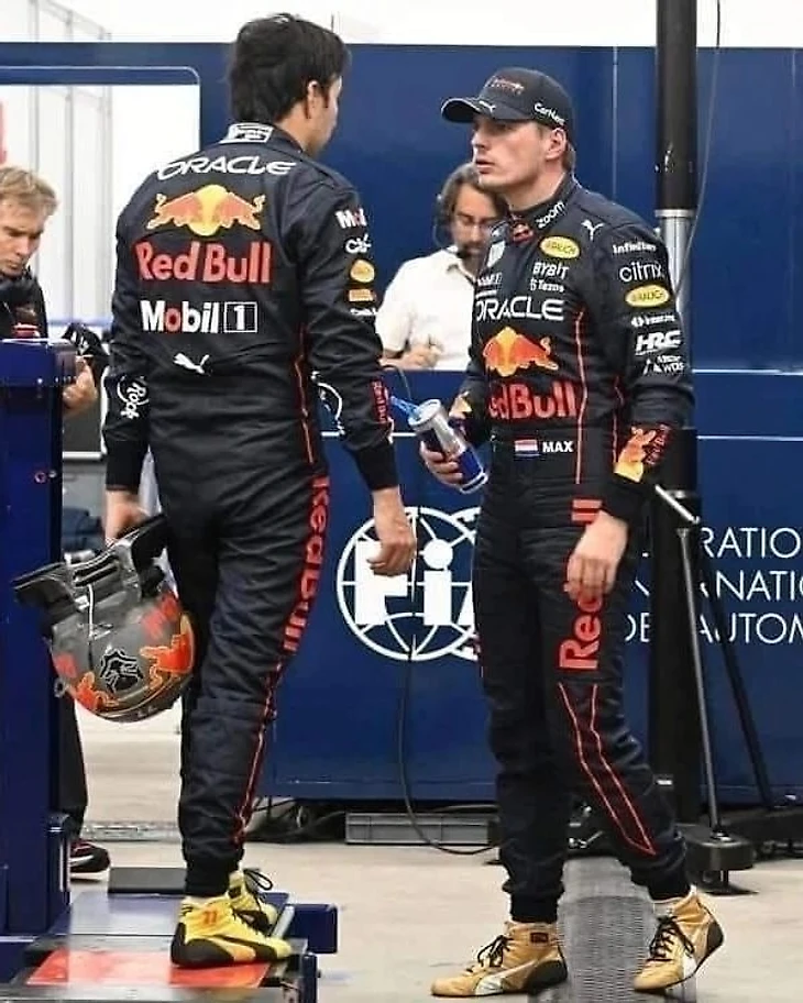 А после финиша Ферстаппена ждали несколько неприятных разговоров – вот кадр их общения с Пересом на взвешивании.
