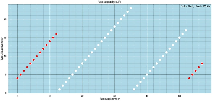 Типы шин, которые использовал Макс, стартовал на soft, потом использовал два комплекта hard, а на финишный спурт, с учетом сложившихся обстоятельств перешел на soft, в котором было четыре круга, а ведь у Льюиса был hard, в котором было уже 40 кругов: