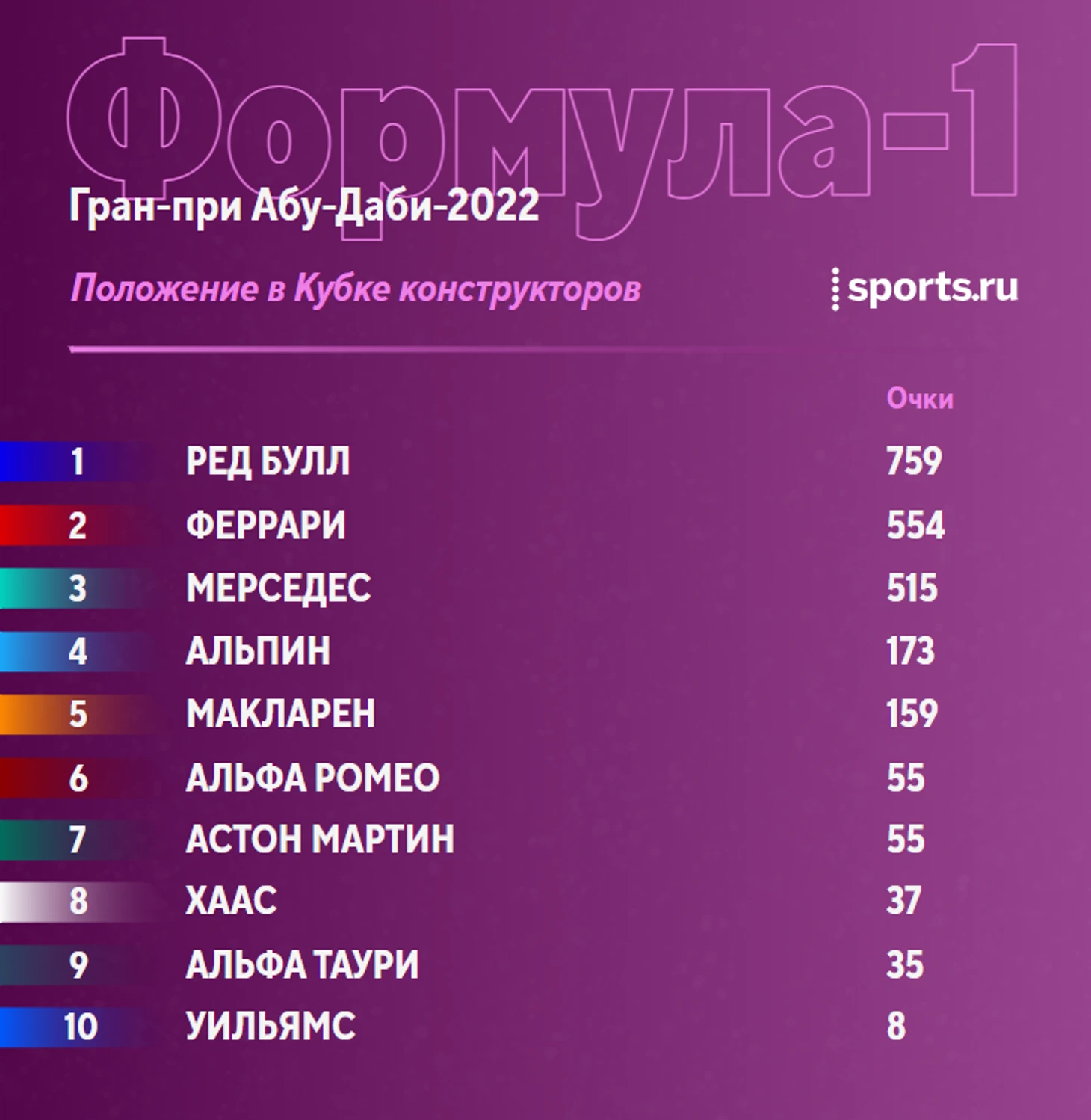 Нижняя таблица – агрегированный показатель для команд: бирюзовый столбик – «Мерседес», синий – «Ред Булл», красный – «Феррари», оранжевый – «Макларен», розовый – «Альпин», серо-синий – «Альфа Таури», зеленый – «Астон Мартин», голубой – «Уильямс», бордовый – «Альфа Ромео», белый – «Хаас».