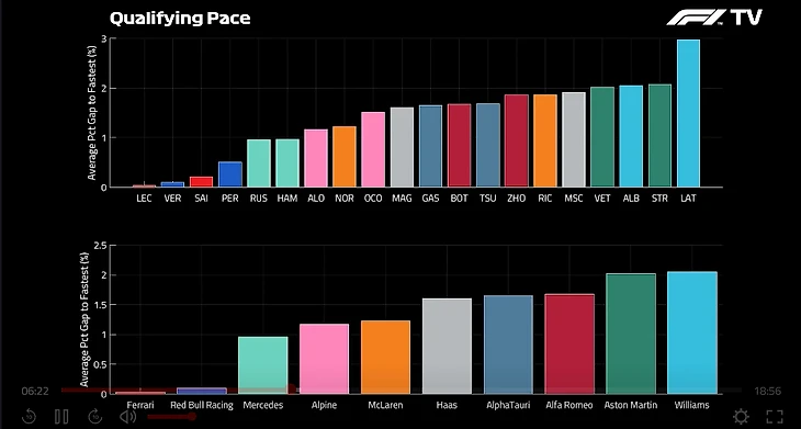 Верхняя таблица – гонщики: LEC = Леклер, VER = Ферстаппен, SAI – Сайнс, PER – Перес, RUS – Расселл, HAM – Хэмилтон, ALO – Алонсо, NOR – Норрис, OCO – Окон, MAG – Магнуссен, GAS – Гасли, BOT – Боттас, TSU – Цунода, ZHO – Чжоу, RIC – Риккардо, MSC – Мик Шумахер, VET – Феттель, ALB – Албон, STR – Стролл, LAT – Латифи.