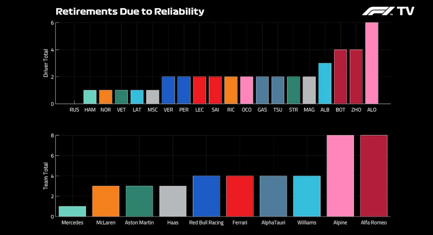 Но главный сюрприз из статистики – Алонсо. Мы знали, что ему очень не везло в этом сезоне, но данные показывают, насколько же он был хорош – даже несмотря на поражение от Окона по очкам. Он победил Эстебана по квалификационному и гоночному темпами с большим отрывом. Все сходы Алонсо произошли из топ-10 – позиций с очками. Понятно, почему к концу сезона его так злила команда и он так обрадовался переходу в «Астон Мартин». Все-таки только он и Макс не сходили из-за столкновений. Да, он встречался со стюардами чаще из-за инцидентов, но… Данные показывают: он не зря хотел многолетнее соглашение и все еще ездит на пике формы».