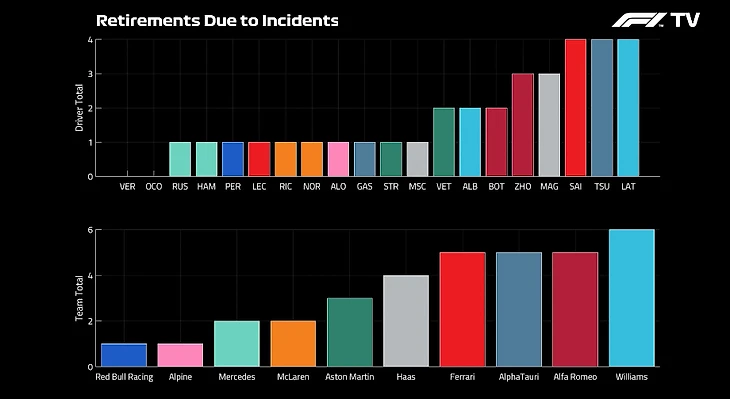 С другой стороны, комбинация двух чартов со сходами объясняет, как Макс проехал больше всех кругов – 1271 (или 98,22% всей дистанции сезона), Леклер среди всех только 9-й (1189 кругов), а Сайнс – вообще последний из постоянных (1033 круга, меньше – только запасные Хюлькенберг (107) и де Врис (53 круга).