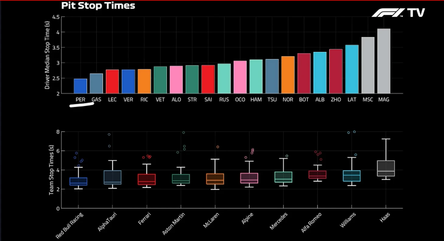 Верхняя таблица – медианное время пит-стопов для пилотов (легенда – та же), нижняя – распределение и медиана среднего времени пит-стопов для команд, точки – не попавшие в «обычную» зону остановки.