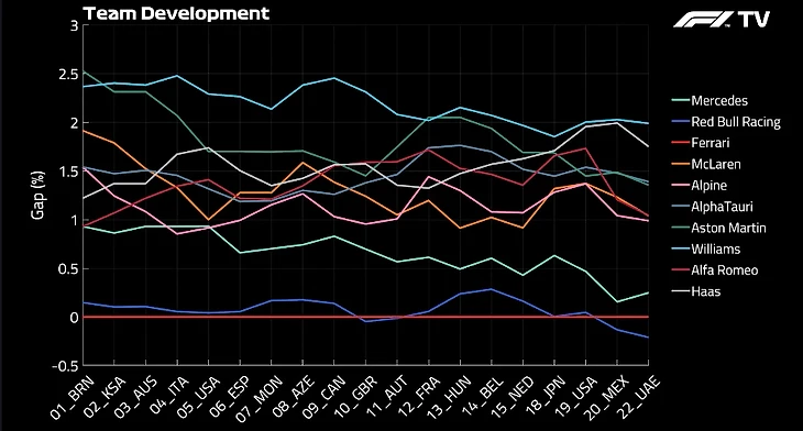 Бирюзовая линия – «Мерседес», синяя – «Ред Булл», красная – «Феррари», оранжевая – «Макларен», розовая – «Альпин», серо-синяя – «Альфа Таури», зеленая – «Астон Мартин», голубая – «Уильямс», бордовая – «Альфа Ромео», белая – «Хаас».