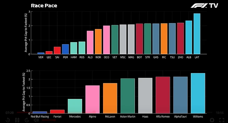 По гоночному темпу уже Хэмилтон оказался слегка быстрее Расселла. Разница между Алонсо и Оконом оказалась еще больше.