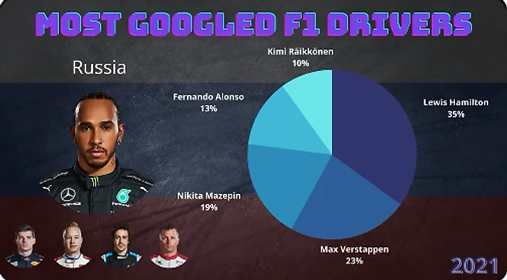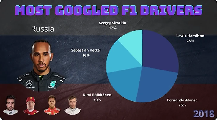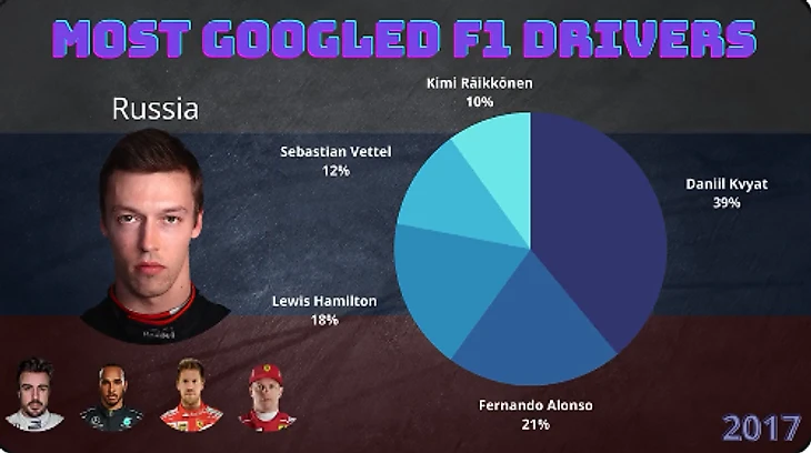 Какими гонщиками «Формулы-1» интересовались больше всего в России за последние 10 лет? Спасибо исследованию твиттер-аккаунта F1Trendz – он сделал выгрузку данных гугл-запросов по странам и сформировал ответы в виде понятной инфографики.