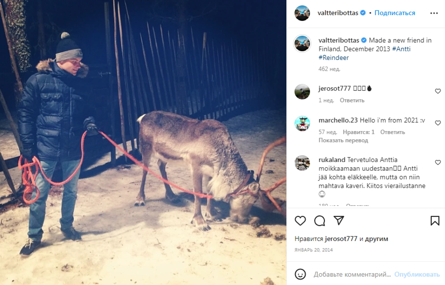 Вообще первое знакомство с оленями у Боттаса состоялось в декабре 2013-го – в деревушке Кильписъярви за Полярным кругом, где у Валттери есть своя усадьба (туда даже продают туры через агенcтво Valtteri Bottas Experience).