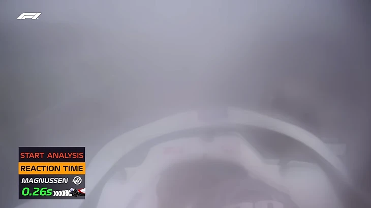 Но, конечно, отдельная номинация скорости реакции и бесстрашию в дождь уходит Магнуссену: Стролл-то провалил реакцию на светофор и срыв с места (0,46), но объехал соперников по траектории без брызг, а Кевин не только взлетел как посуху за 0,26 секунды, но еще и рвал вот в такой видимости: