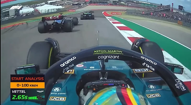 9. Себастьян Феттель («Астон Мартин») на Гран-при США – 0,25 секунды на реакцию, достижение 100 км/ч за 2,65 секунды,+5 позиций.