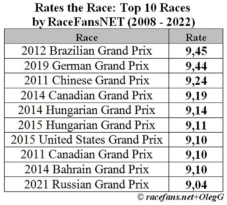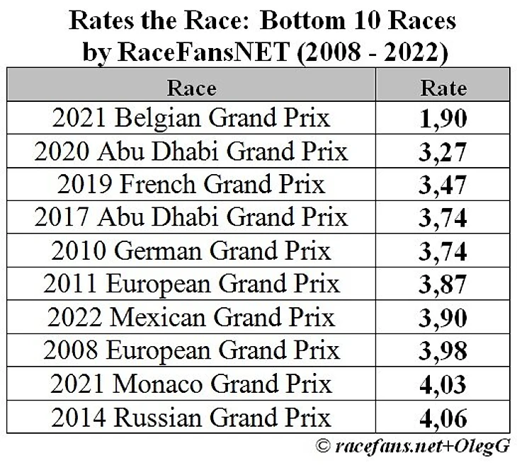 На сайте racefans.net рейтинги составляются на регулярной основе с 2008 года. Это дает возможность составить ТОП 10 для лучших и худших гонок за 14 лет. Причем этот сезон внес изменения в ранжир "худших".
