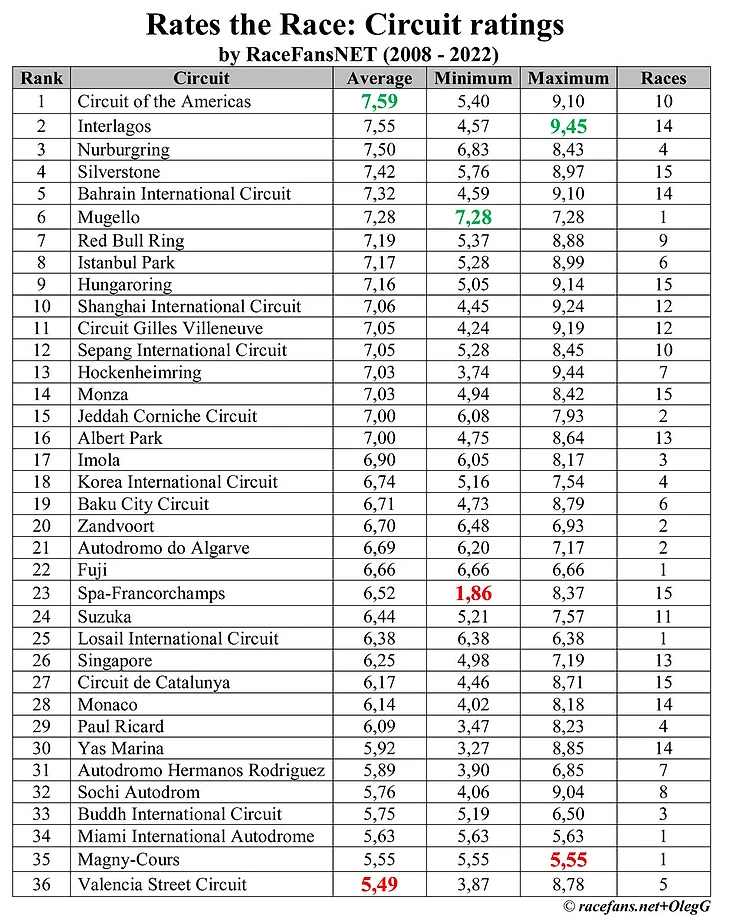 Еще одна интересная подборка: рейтинг гоночных трасс на основе оценок гонок на сайте racefans.net с 2008 по 2022 год: