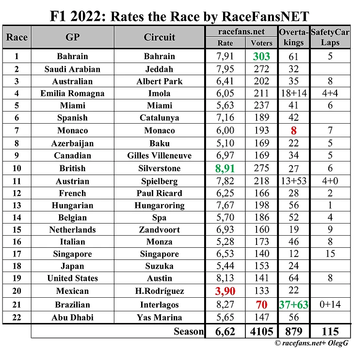 Уже не первый год слежу за соответствующей данной теме информацией на сайте RaceFans.NET, специализирующемся на теме автогонок. Несмотря на субъективность некоторых оценок, итоговая статистика позволяет сделать сравнительную оценку "интересности" прошедших гонок.