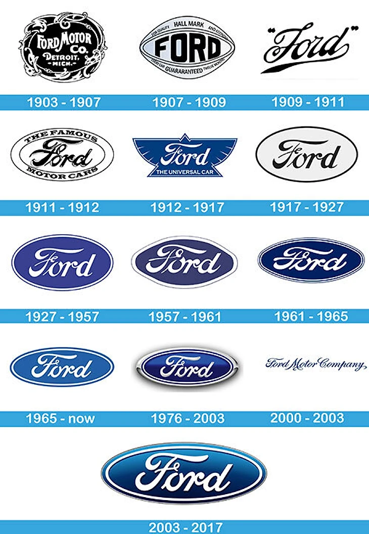 Шрифт «Форд» по большому счету не менялся с тех самых пор. Сначала радиаторы автомобилей украшала просто надпись «Форд». Затем ее заключили в овал. В 1927-м монохромность фордовской эмблемы сменило сочетание серебристых букв на темно-синем фоне. За исключением небольшого периода 30-х годов, когда цвет фирменной подложки поменялся на красный, логотип дошел до наших дней практически в первозданном виде.