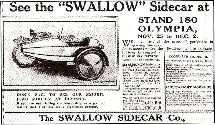 Еще до войны будущий директор Jaguar cars Уильям Лайонз основал небольшую кузовную мастерскую по производству… колясок для мотоциклов. Свою фирму Уильям назвал Sidecar Swallow – «Коляски ласточка».