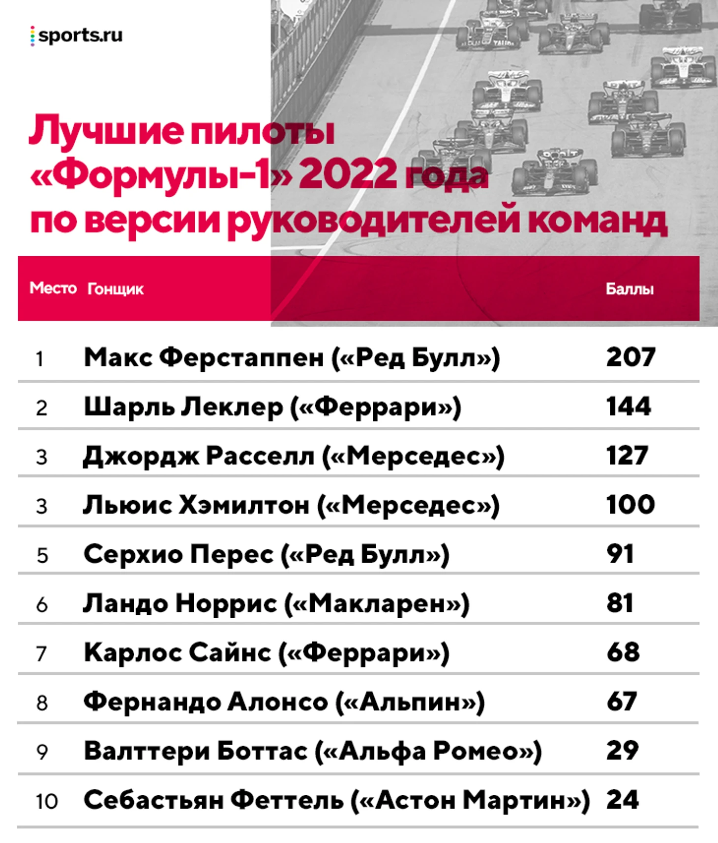 У «Формулы-1» есть еще одна новогодняя традиция: проводить среди боссов команд и самих гонщиков опрос на звание лучшего пилота года. Он анонимный, критерии не раскрываются, даже участвуют не всегда все (в предыдущие годы рейтинг формировали без шефа «Феррари» Маттии Бинотто, а в этот раз гонщики обошлись без голосов Льюиса Хэмилтона).