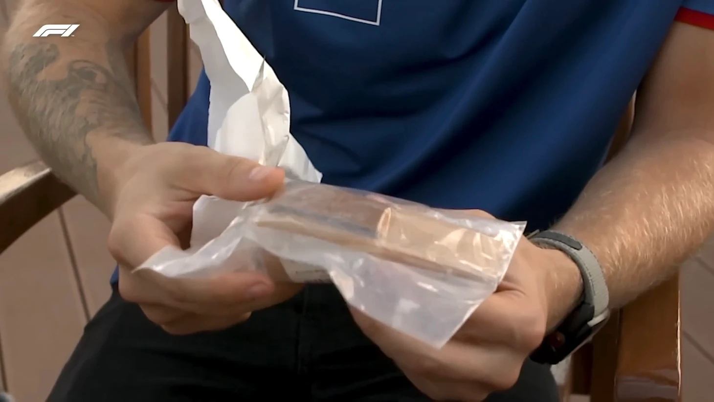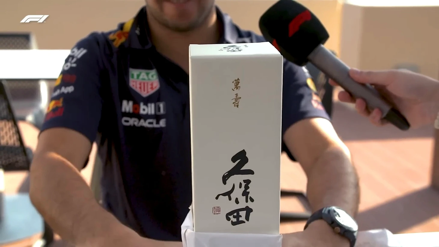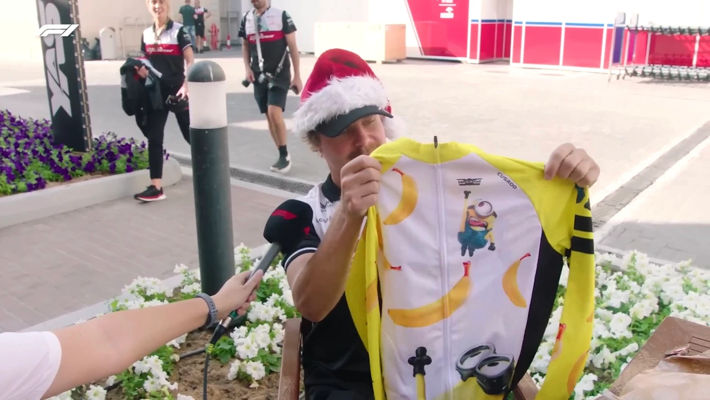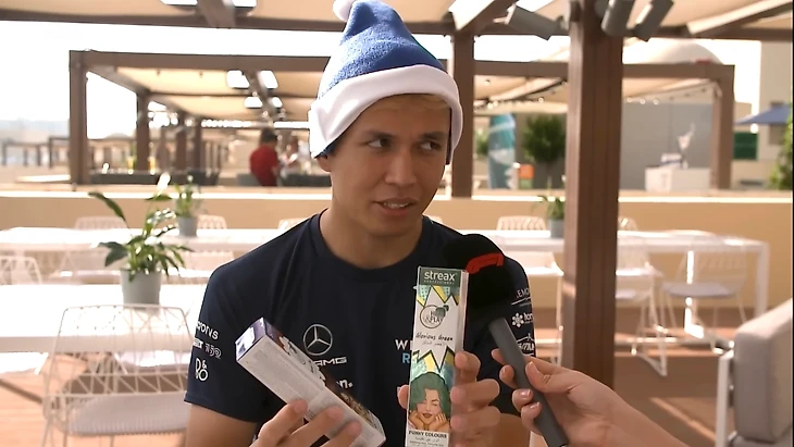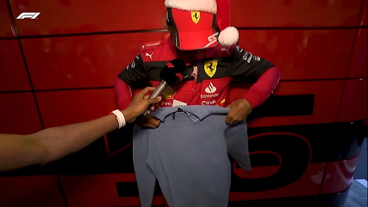 В модниках окажется и Карлос Сайнс: его согреет фирменный свитер нежно-голубого цвета от «Альфа Таури» – подарок от Пьера Гасли. Удобно, когда твоя команда в дополнение еще и модный бренд: «Красивый цвет. Такой уютный, зимний, специально для сидения близ огня (камина)».