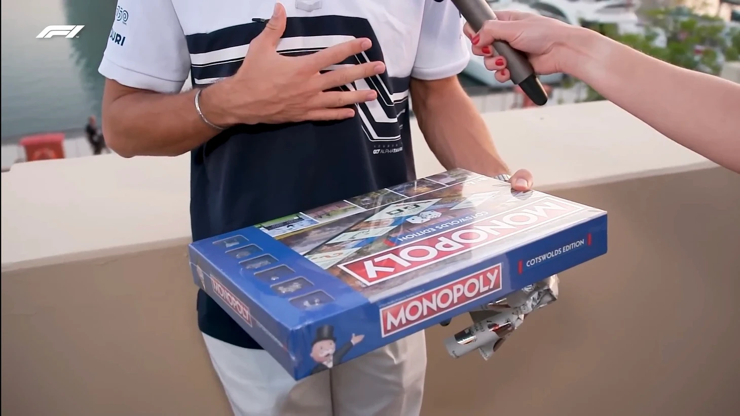 «(Трясет) Похоже на «Монополию». О боже! Клянусь, я не знал! Не стану лгать, дома в Милане у меня нет ее, так что я собирался купить игру. Так что тот, кто решил подарить мне ее – это была отличная идея. Спасибо большое, Фернандо. Вместе со своей машиной он еще и подарил мне «Монополию». Очень мило с его стороны. Спасибо».