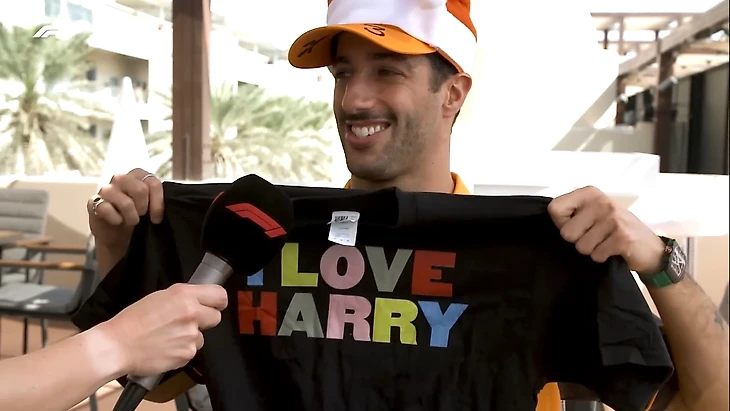 Футболка – отсылка к Гарри Стайлсу из некогда популярной группы One Direction: тот однажды засветился в мерче Риккардо.