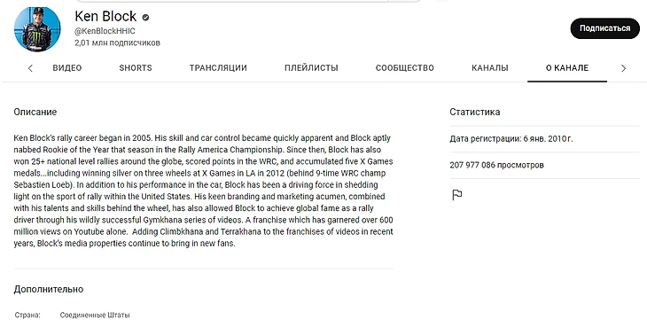И это с учетом создания обоих в 2010-м – экстремальные ролики с «Джимханой» и другими трюками начали выходить сильно раньше, и только описание канала уверяет, что их к моменту создания посмотрели 600 млн раз. Более того, трюки Блока продолжили выходить на каналах DC Shoes, GoPro, Monster Energy и других и после создания личных каналов.