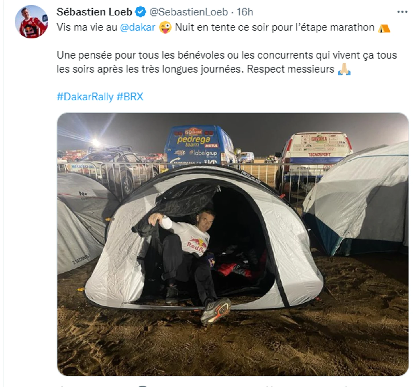 Девять титулов чемпионата мира по ралли? 80 побед на всевозможных заездах? Шестой «Дакар» и 16 побед на этапах? Статус вечного фаворита? Это все о Себастьяне Лебе – и все равно легенда гонок по пересеченной местности в 48 лет не научился раскладывать обычные туристические палатки из Decathlon за сотню евро с быстрой системой раскладки.
