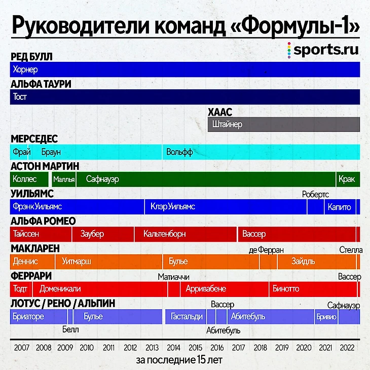 У остальных команд тоже большинство смен руководства – следствие продаж команд («Заубер», «Уильямс», Астон Мартин») либо ухода боссов на повышение (Вассер) или на пенсию (Браун).