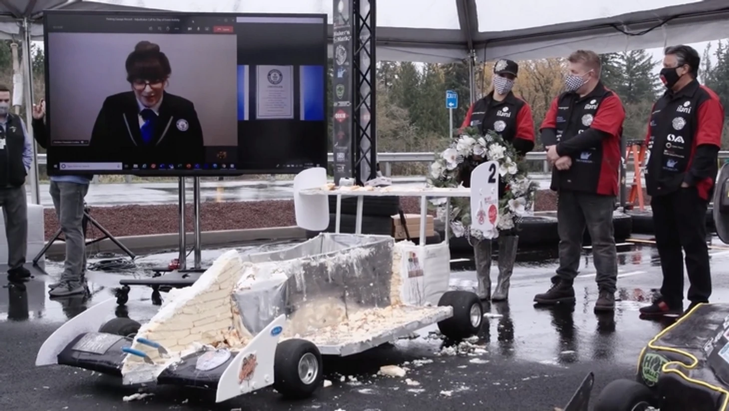Специально для замера, проверки и подтверждения привезли юристов Книги Рекордов Гиннесса. Они зарегистрировали скорость в 27,5 км/ч и преодоленную дистанцию в 106,3 метра – и отдали Андретти рекорд за самый быстрый торт в истории.