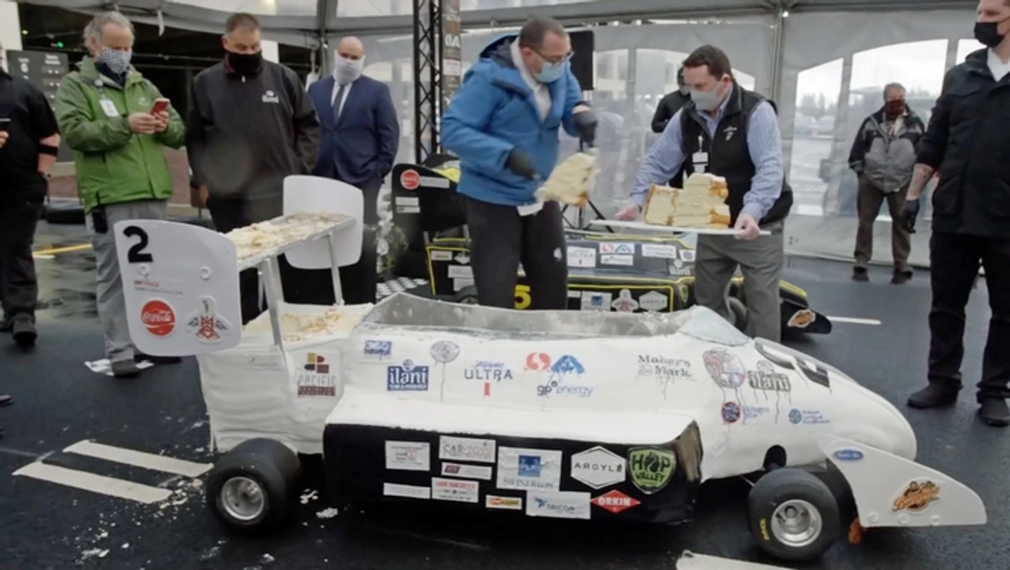 А после заезда торты весом 303,5 кг распилили и разделили между «сборочной командой», гонщиком, юристами Гиннесса и подопечными Ванкуверского приюта для бездомных.
