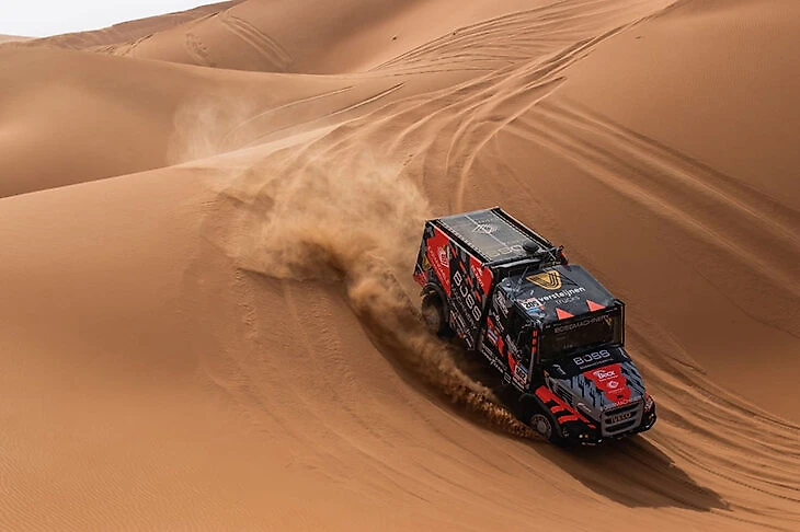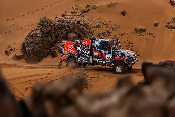 Только на седьмом «полумарафонском» этапе к Янусу ван Кастерену пришла первая победа на этапе. На скалистом каньоне перед входом в дюны он обогнал Митча, оторвался от уже показавшегося в зеркалах Мацика, а в конце спецучастка на гравийных дорожках приходилось резать углы, прокладывая маршрут для других грузовиков. Но и этот спецучасток оказался для Януса не без приключений – деревом он разбил лобовое стекло, а на сервис механикам давалось всего два часа. Но команда справилась и с этой задачей, заменив стекло и проведя необходимое техническое обслуживание.