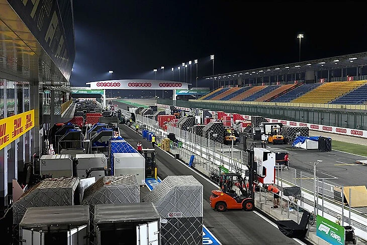 Грузы, обычно, прибывают на трассу днем во вторник-среду и выгружаются на стартовую прямую напротив будущих боксов команды. Примерно к 6-7 часам вечера бесконечные ящики превращаются в гаражи.