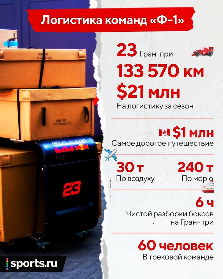 Чтобы выиграть гонку, мало просто посадить пилота за руль болида в воскресенье (даже если это Макс Ферстаппен) – нужно этот болид собрать. А чтобы его было где собирать, необходимо обустроить гараж и моторхоум – и они возникают не из воздуха. Тонны и тонны груза для начала нужно перевезти из одного города, страны и континента на другой.