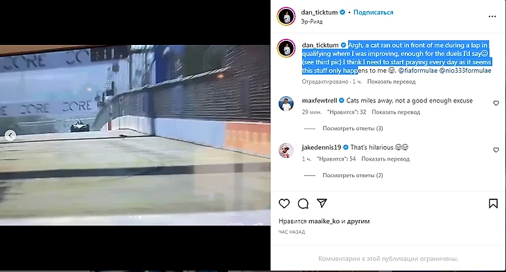 Бывший скандалист из систем «Ред Булл» и «Уильямса» Дэн Тиктум осваивается в «Формуле Е», но ему и здесь не везет: в квалификации на Электропри Саудовской Аравии кошка перебежала дорогу перед его болидом – пришлось тормозить и сбрасывать скорость.