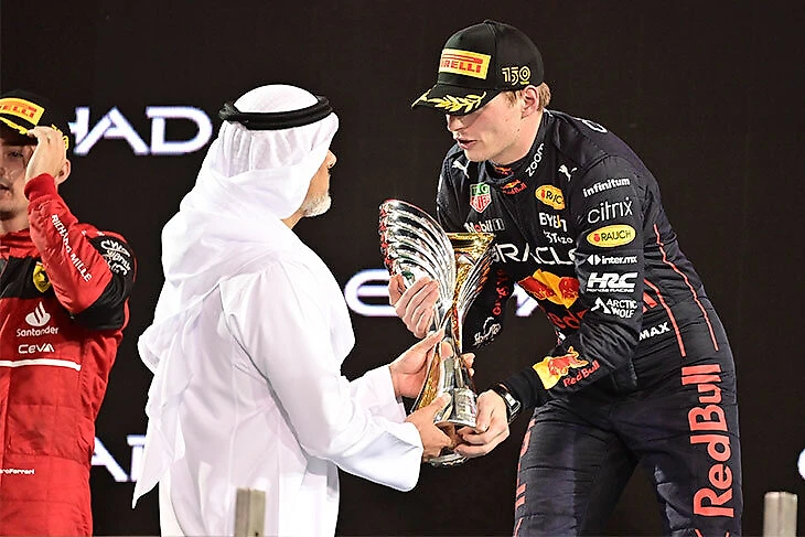 Гран-при Абу-Даби – и вручающий Максу Ферстаппену приз шейх Халид бен Зайед Аль Наян: