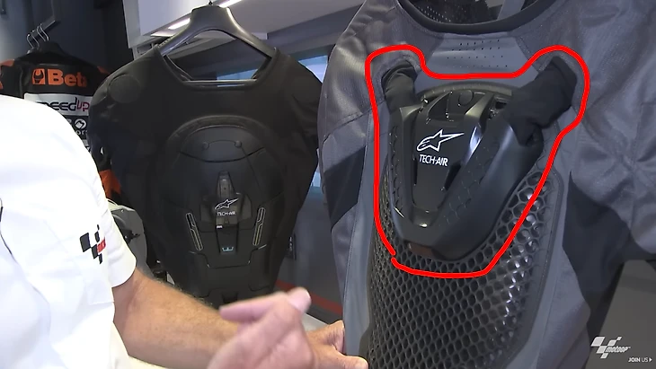 Первые реальные образцы появились только в конце 90-х. Изначально подушка безопасности представляла из себя надувной жилет, который пристегивался к байку. И когда гонщик падал, внутри жилета взрывалась колба с углекислым газом и надувала защиту.