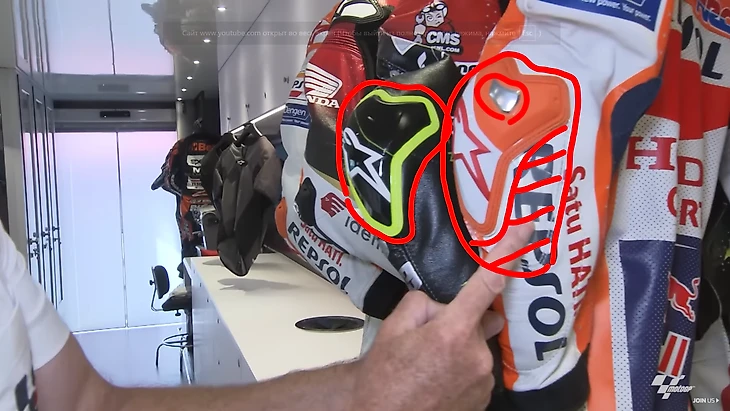 Лоренсо вообще не касается поверхности трассы локтем, в то время как Маркес скользит на нем через весь поворот. Поэтому его локтевая защита больше, чем на комбинезонах других гонщиков и даже имеет специальную алюминиевую вставку, продлевающую срок использования защиты.