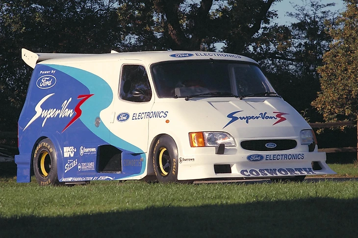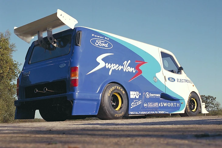 Третий Supervan построили в 1994-м, чтобы рекламировать обновленный минивен. Впервые до выхода серийной модели, кстати. Ребята из DRL Engineering взяли шасси Supervan 2 и изготовили кузов в масштабе 7/8 от реального Transit. А еще поставили новый мотор - Ford-Cosworth HB Formula 1 V8 на 650-700 л.с. с отсечкой на 13 800 об./мин. Supervan 3 появлялся на публике до 2001 года, причем последний раз – в красной ливрее Королевской почты.