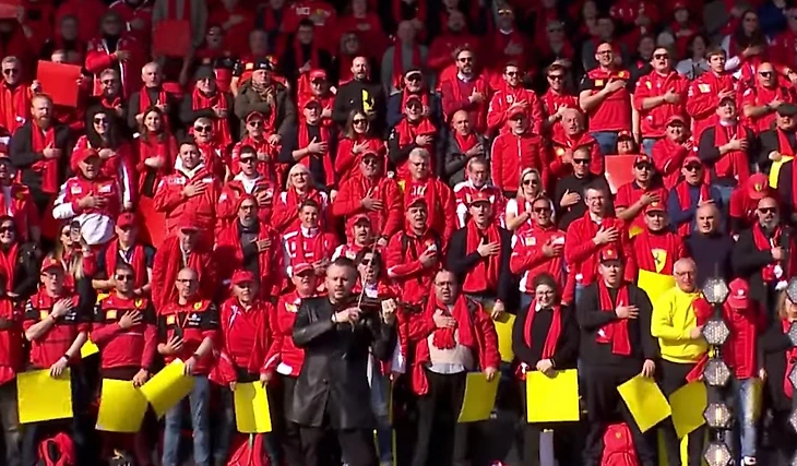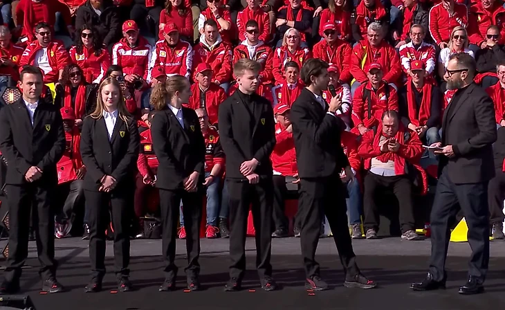 Саму презентацию, проходящую, к слову, на домашней трассе команды «Фьорано», начали с присущим итальянцам размахом – с гимна Италии. Толпа тифози, стоящих на трибуне возле сцены, с большой гордостью поют главную песню страны. Яркости добавляют жёлтые и красные листовки в руках фанатов (два главных цвета в дизайне «Феррари»), создающие изображение большого сердца на трибуне.