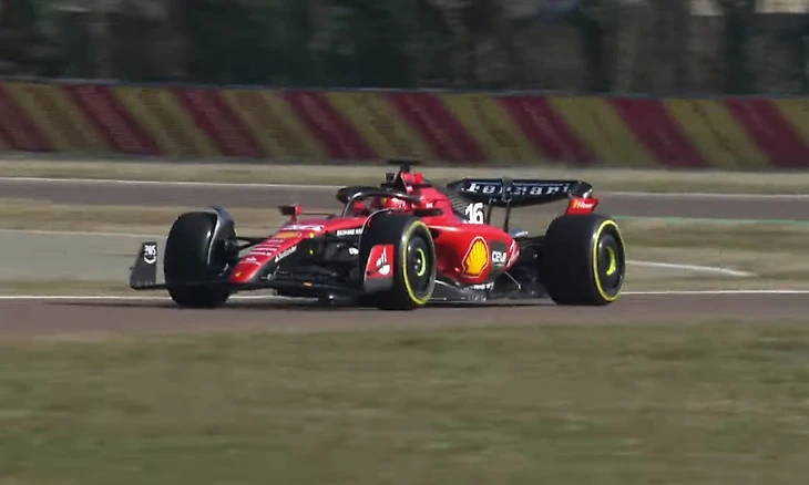 Однако, главный сюрприз презентации это обкатка новой машины прямо здесь и сейчас. Интересно и то, каким образом в «Феррари» выбирали, кто первым проедет на SF-23. В трансляции появляется небольшое заранее записанное видео, где Вассёр предлагает подкинуть монетку и определить счастливчика. Им оказывается Шарль Леклер. Тифози на трибуне тут же поднимают листовки белого и красного цвета, чтобы «поднять» флаг Монако в честь пилота.