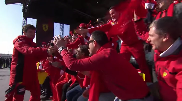 Командное радио подключили к динамикам на трибуне, так что все отлично слышали впечатления Леклера прямо с трассы и его весьма живой разговор с Сайнсом.
