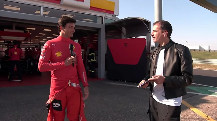 А дальше самое невероятное: после показа первых изображений болида нас перенесли к боксам, где Сайнс с Леклером разыграли право первого выезда в монетку. Карлос проиграл и беседовал с ведущими, пока Шарль готовился!