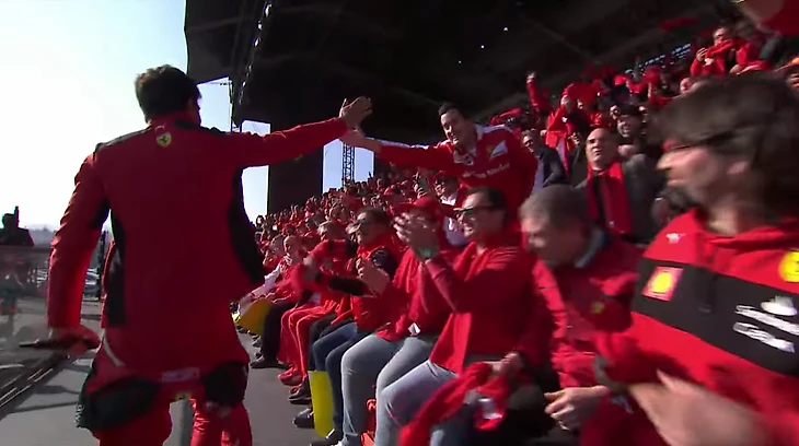 Через минуту после представления ведущих появились пилоты – Карлос Сайнс и Шарль Леклер. Они поприветствовали всех зрителей классным проходом вдоль трибуны – и даже давали пять: