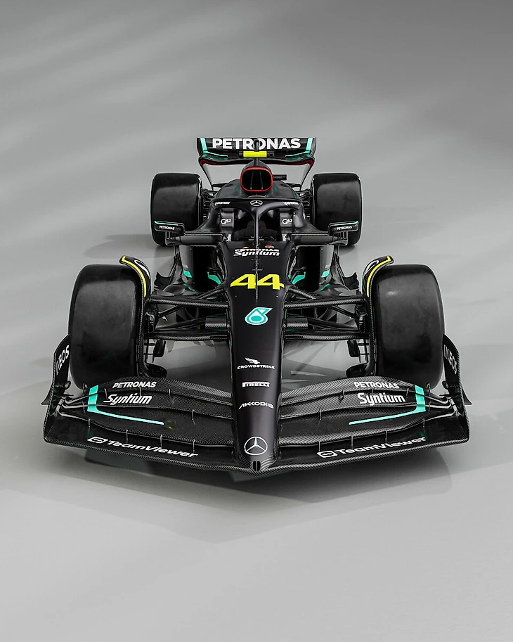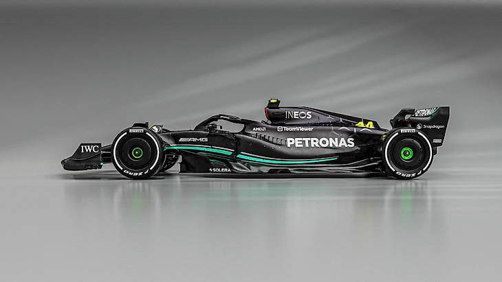 Дизайнеры заставили ливрею работать буквально парой мазков по черному холсту. Звездный паттерн стал совсем бледным, красный воздухозаборник Ineos сократили до тоненькой полоски, убрали светлые антикрылья и даже логотипы титульного спонсора Petronas с боковой части. Партнеру оставили лишь лого на носовом обтекателе, белую надпись и бирюзовую волну – фирменный элемент дизайна.