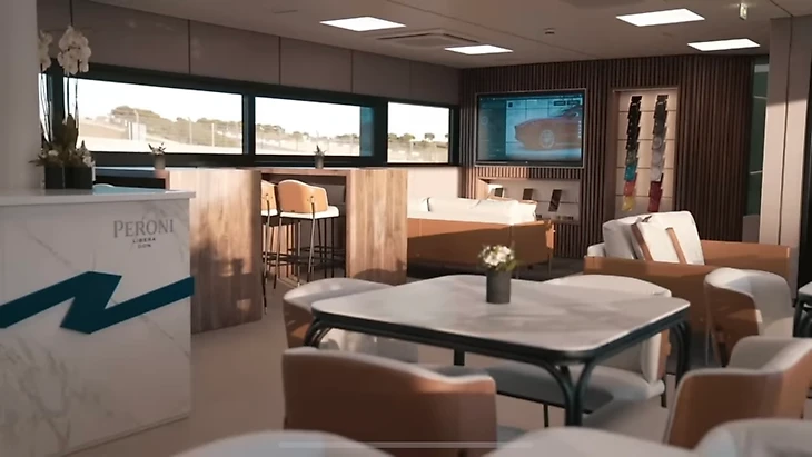 Обратите внимание на прозрачную полку для наград, установленную прямо напротив выхода, чтобы даже те, кто просто проходит мимо смогли взглянуть на успехи команды. Раньше тут стояли 6 кубков команды за подиумы – все трофеи за 10 лет в серии. В комнате для переговоров принты с машинами — единственный цветной акцент в преимущественно белом пространстве.