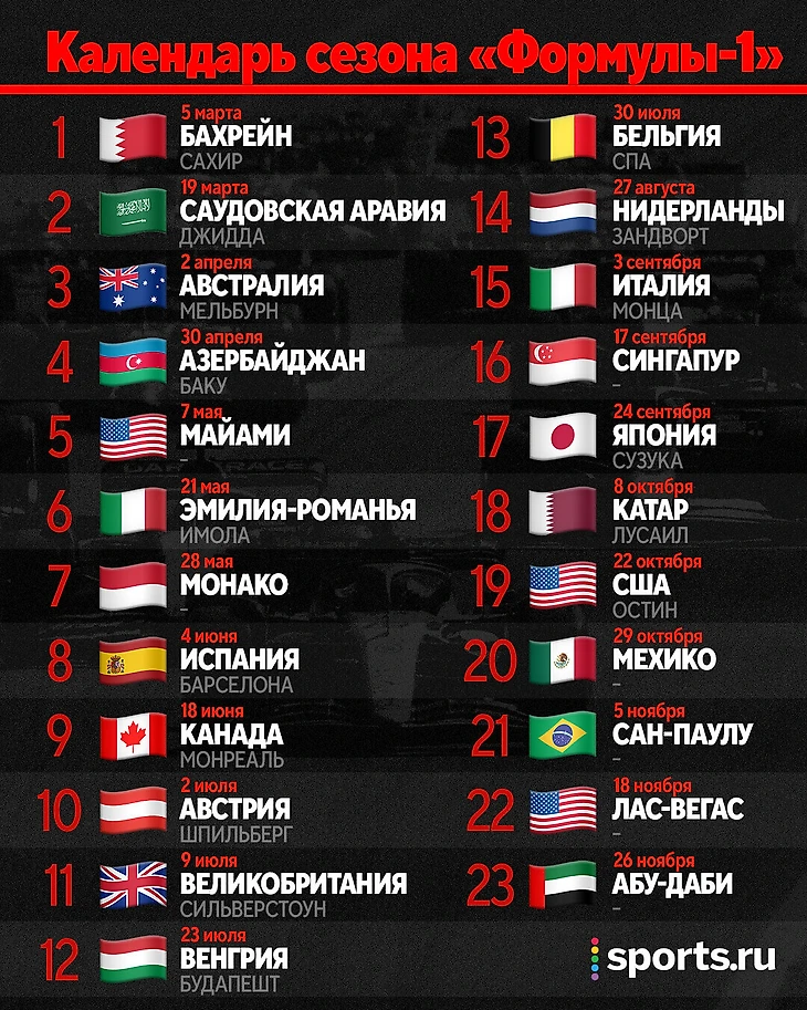 В этом году должны были состояться рекордные 24 этапа, но вновь подвел Китай – гонку в Шанхае отменили еще осенью под лозунгом полной нетерпимости к ковиду, а корректировка курса отношения к болезни для «Ф-1» оказалась запоздавшей – календарь давно утвердили.