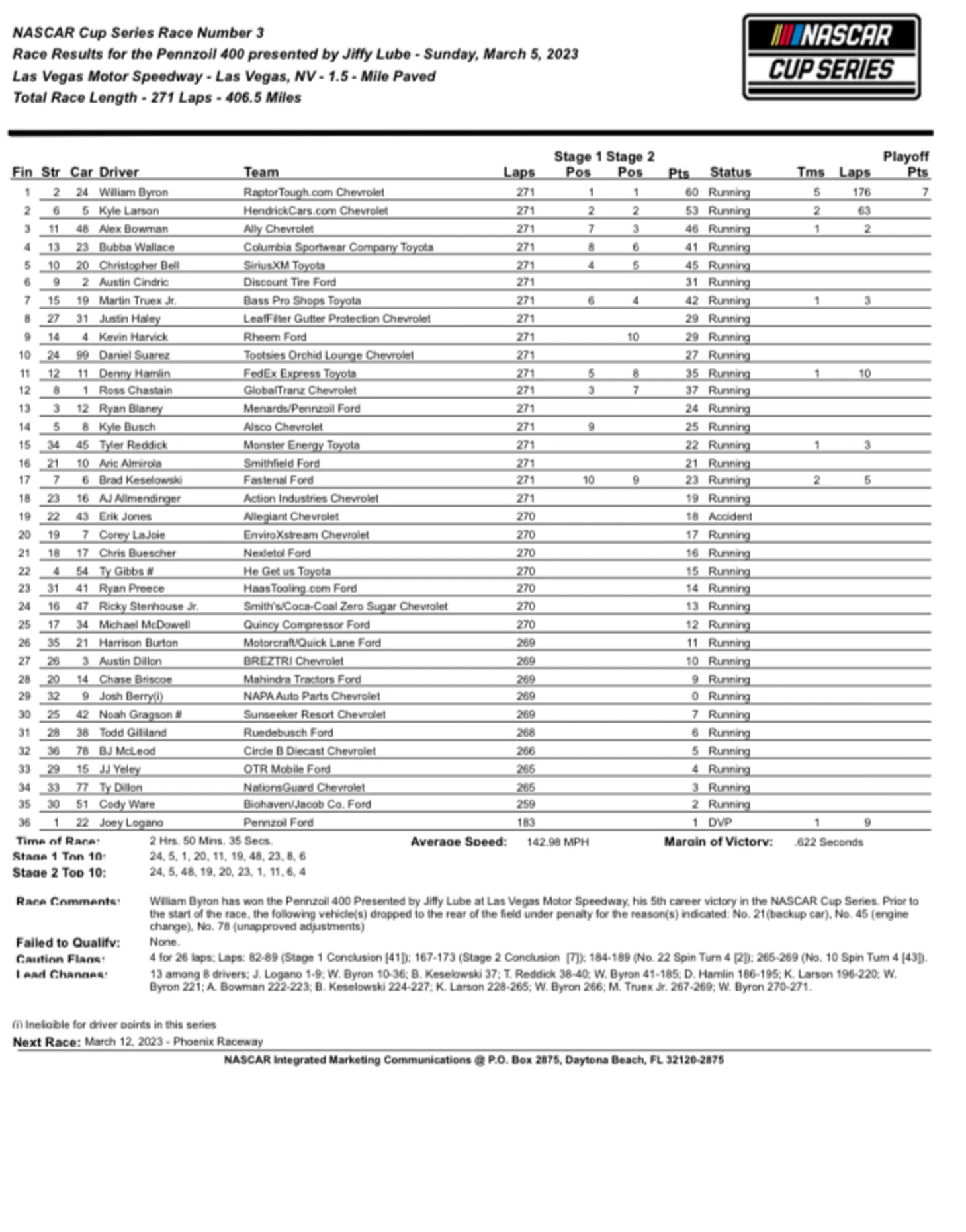 В воскресенье прошел третий этап NASCAR Cup Series на 1,5-мильном овале в Лас-Вегасе. Чемпион 2022-го года, Джоуи Логано взял поул накануне в квалификации. Вместе с ним с первого ряда стартовал гонщик Hendrick Motorsports Уильям Байрон.